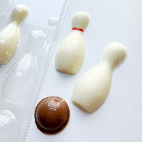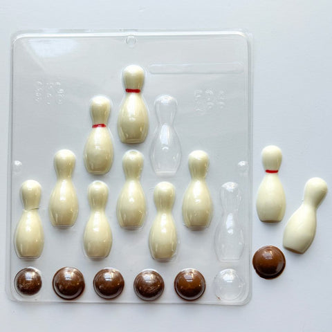 Bowling assortment candy mold makes little bowling pins and bowling balls out of chocolate that are the perfect size for decorating cakes and cupcakes!