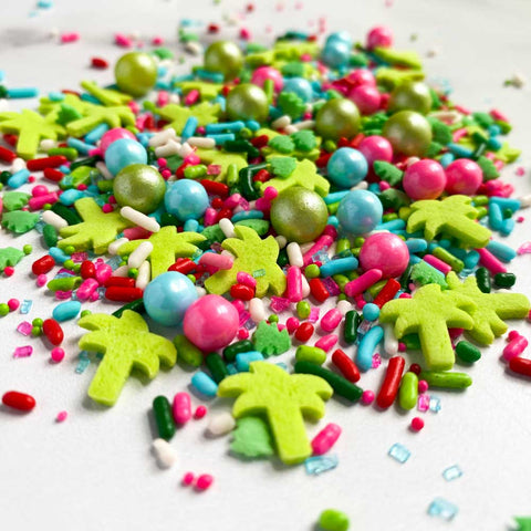 Our Christmas in July sprinkle mix contains brightly colored sugar pearls, jimmies, sanding sugar, non-pariels, edible palm tree shapes, and Christmas tree shapes.