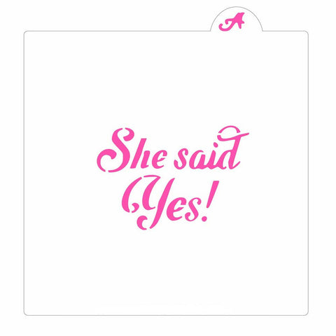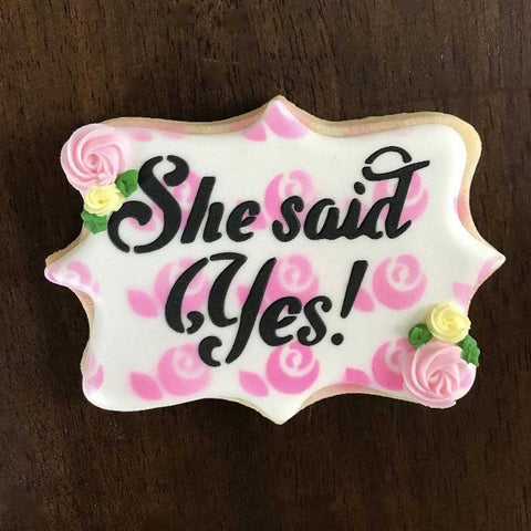 When announcing an engagement, our She said Yes Cookie Stencil is the perfect design for decorating a bride and groom's wedding announcement ! The script lettering measures about 3 inches x 2 inches.